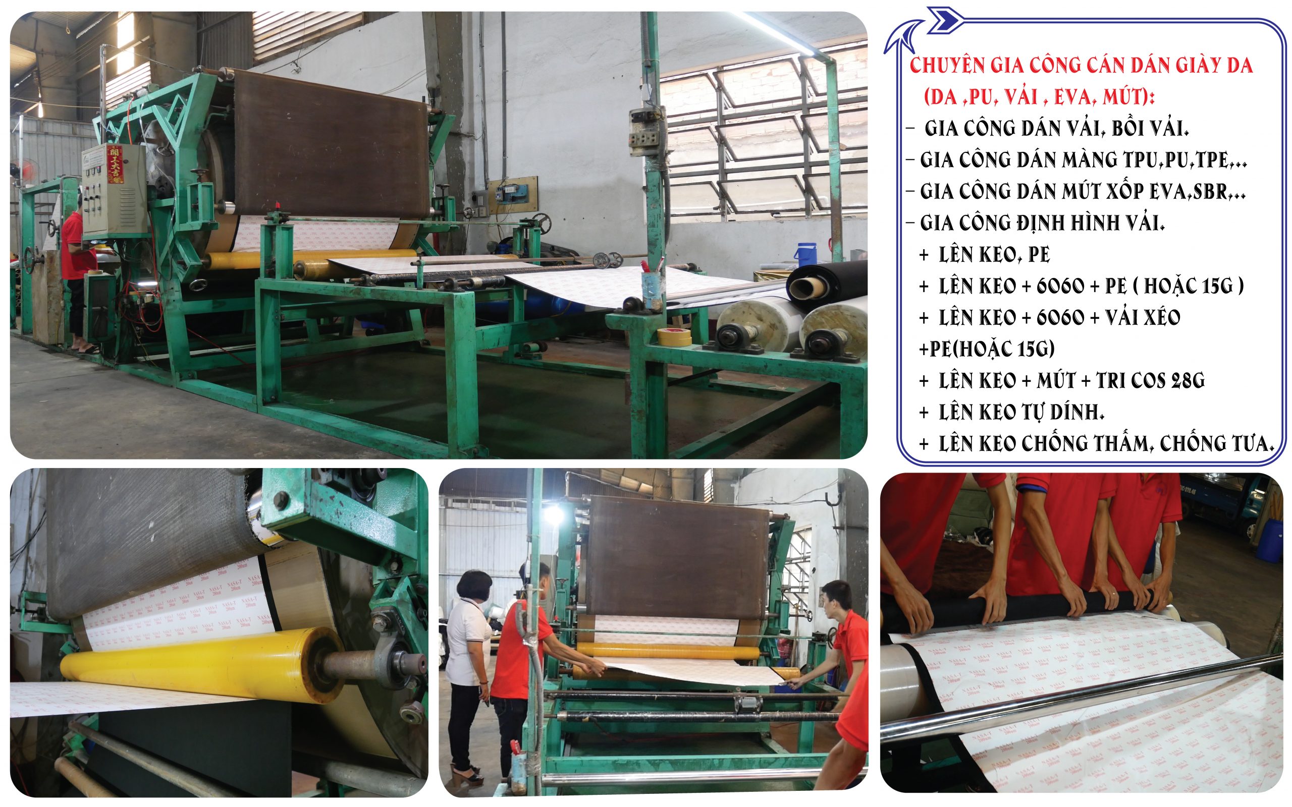 Chuyên gia công cán, dán trong ngành da, giày (Da, PU, Vải, Eva, Mút)...